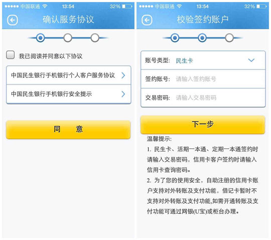 1.登陸手機銀行點擊自助注冊,進入確認服務協議頁面,勾選“我已閱讀並同意以下協議”,並點擊同意,進入校驗簽約賬戶頁面;選擇賬號類型、簽約賬號、交易密碼后,點擊下一步。賬戶類型可以選擇為民生卡、活期一本通、定期一本通和信用卡。