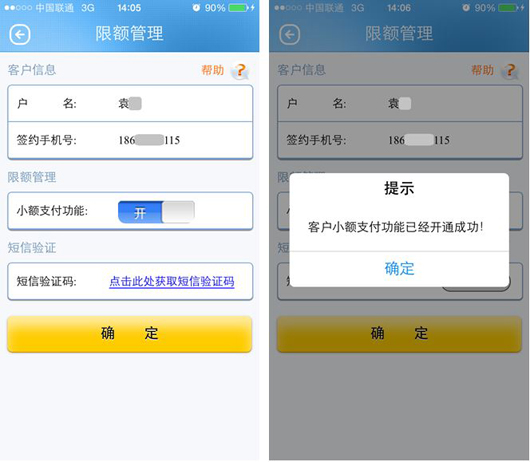 已自助注冊客戶:登錄手機銀行后,通過個人設置功能中的限額管理服務申請開通小額支付功能。